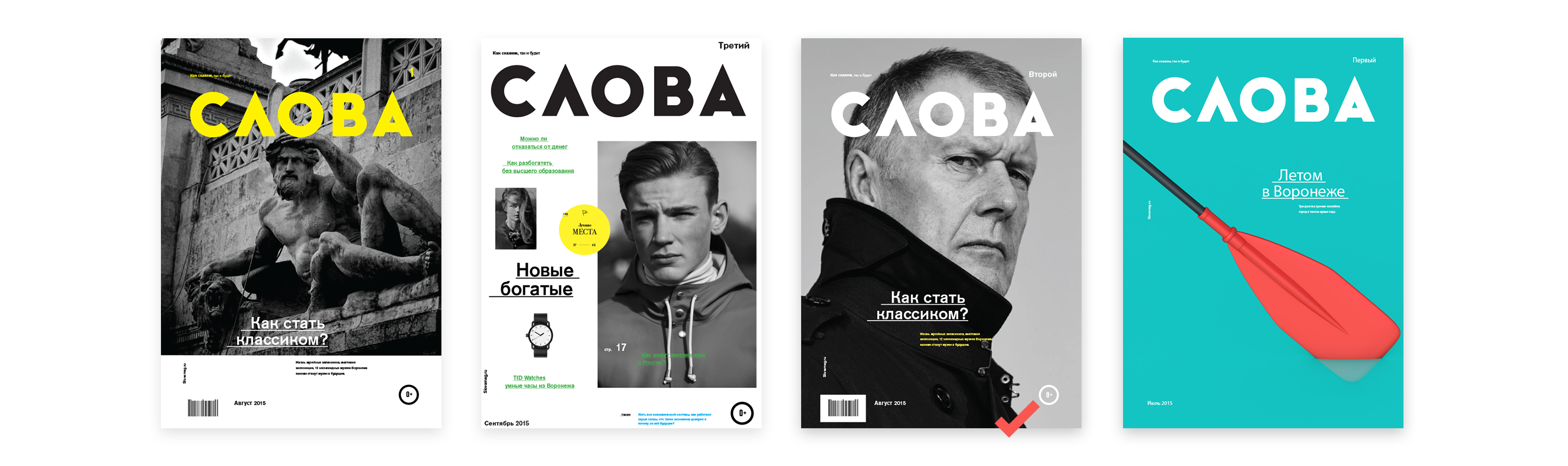 Буквы составляют слова, слова составляют предложения, предложения рассказывают историю. Сама идея, назваться «Словами», фокусирует внимание читателя на контенте, на том, что написано, на смысле и сути. И в этом варианте, где мы предложили контрастно и крупно выделить не слово «Слова», а первую его букву «С», — мы хотели передать идею фокуса и концентрации. Уверены, журналы с крупной «С» привлекали бы читателя в общем ряду городского глянца.